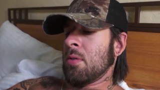 Pierced brunette twunk Rob rubbing his massive cock in a