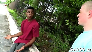 Chocolate thug plays with wang of milky dude by his throat